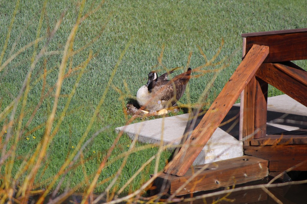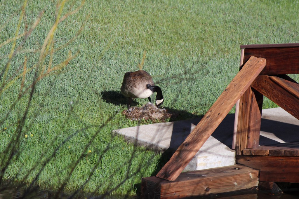 There was a small pond that was just below our condo door that had an arched bridge that allowed you to walk onto what is a tiny, round island of grass. Truthfully, it resembled a moat around a castle, as the water surrounded you on each side if you were to cross the bridge to the grassy circle of land. On our stay here we never made it across the bridge. It had been booked before we arrived and unbeknownst to us at the time, paid for in advance by a Canada goose and his mate, affectionately referred to as G1 and G2. Just off the steps of the bridge and in full view of our front condo door, was a well lined and perfectly shaped nest full of eggs that was occupied from our arrival to our departure date, with a very vigilant and at times a bit cranky female goose. On one occasion the K’s and I got to witness the duo in action of defending the soon to be born offspring as the female slowly rose from the nest, carefully and skillfully covered each egg with the downs of her feathers from the nesting material, and swiftly swam to the nearby shore to gorge herself on grass, insects, and any ill placed worms that stood in her path. The male, who has a slightly longer and thicker neck and rounded tail, was nowhere to be found. All was calm and bright until a crow happened to land on the small island and was conspicuously close to the covered egg cache which in turn raised the alarm for both mother and father to be. The male, G1, had been watching from above us on some unseen balcony from our spot below. He made his appearance quick and decisive and descended on the crow like an avalanche of snow roaring down a mountain, and then proceeded to chase away the interloper. The female, G2, flew back to check things out at the nest and then assumed the setting position once more atop the cluster of eggs. For those reading who would suggest that this goose should pick on someone his own size and not bully smaller animals into submission, I give to you exhibit b, where my brother came back from a morning run only to find the sidewalk leading down from the parking lot to our front door had been closed by the aforementioned G1 who did his best Black Knight impression of puffing up and glaring at K4 with a “none shall pass” half crazed look in his eye. K4 acquiesced and went around the building the long way to the condo. As an aside, no babies were born during our time there. I was expecting a post card or birth announcement to come, alas these young couples never write home.