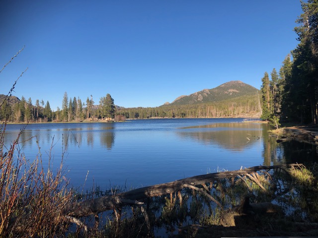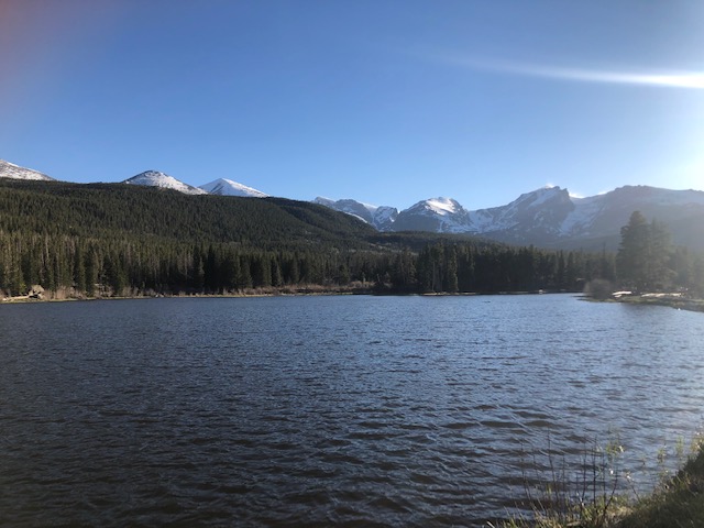 On one such pre-twilight and pre-dusk occasion in Estes Park, K2 and I decided to visit Rocky Mountain National Park and hike, ever so briefly as it would be, around Sprague Lake. The distance to the entrance of the park was only a five-minute drive and so, we set off late in the day with jackets in hand, as the temperature was dipping into the forties when we left the condo. The lake hike is more of a walk around the lake and is recommended for easy hiking to adjust to the higher altitudes of Colorado before one attempts the more strenuous hikes in other parts of the park and/or the state. Just a word or two about that, the altitude thing is no joke. I am sure some have no issues, but we all had some time adjusting with each having various symptoms of dizziness, headaches, shortness of breath. We descended at one point to spend some time at a lower elevation and decided that next trip out there we would spend a little more time in Denver to acclimate properly, but by the time of K2 and I’s excursion we had grown accustomed to the thinner air. We arrived at the park entrance to see the park ranger closing the entrance for the evening and just managed to skim past the barricade that was placed at the booth just after we drove by. It is not everyday that one feels like they have a national park all to themselves, and while we were not all alone in the park, the scarcity of people and cars was such that you felt as if you had fallen back in time where the mountains were the dominant force of nature, and the park was your own backyard. We stopped at a few places on the road which wound its way up and through the mountains. The beauty there was breathtaking. It is difficult to find words to describe what one sees with their eyes. The valleys are broad, and u-shaped from the slow-moving ice from past glaciation events, and you are surrounded by snow peaked mountains that rise from the valley floor and send their snow melt down in raging waters during the spring thaw. It is truly something to behold and something I wish everyone could witness for themselves, with adequate oxygen of course…