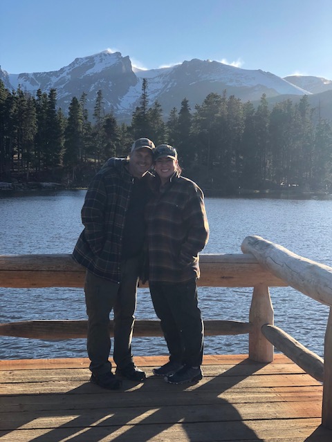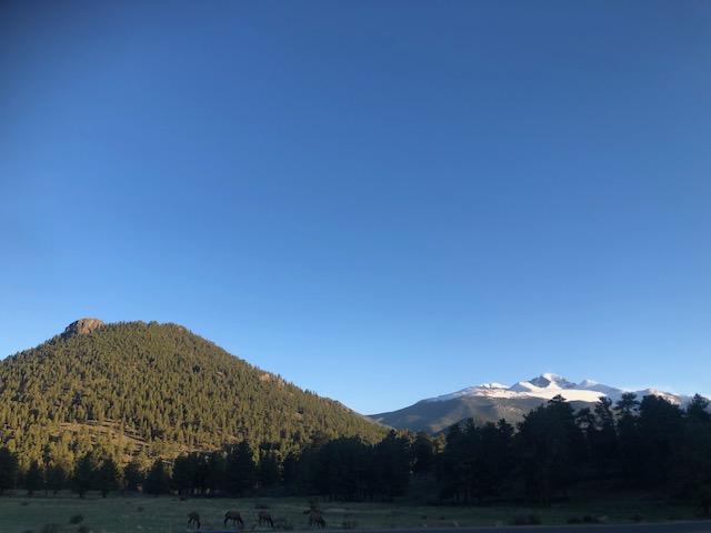 The drive to Sprague Lake was a short one and we arrived with about an hour of daylight left in the day. We found the parking lot only about a quarter full and most people returning to their cars to leave for the night. The hike itself is an easy one. The roundtrip around the lake is just under a mile and there is little elevation change, but the lake itself is at an elevation of almost 8,700 feet. It is mostly like taking a stroll around a local park except that your local park seldom has the beautiful sparkling water of a mountain lake with all those peaks surrounding you, some of which make up the continental divide, as you leisurely walk and gaze up. For those who are more adventurous or with more time to spare, you will find access to other trails from the parking lot, each of varying degrees of difficulty and distance, including the trail to Bear Lake at 3.2 miles away. There are benches along the route around Sprague Lake that gives you a place to sit and soak it all in, and you will want to do so if you have a heart for the great outdoors or just want to restore your soul. Snow and ice were on the trail as K2 and I began our walk. The jackets we brought along were a good idea as the temperatures had dropped into the upper 30’s in the higher elevations. The water was clear, blue, and still. The mountains loomed over the surface of the 13-acre lake as the sun began its final descent behind the mighty peaks for the night. The moon was anxious to get to work on this evening and made its appearance in the faintly lit sky before the sun totally relinquished the day. K2 and I paused for the obligatory selfie on the backside of the walk where a small wooden walkway had been erected for such occasions. A friendly passer-by offered to take the picture instead and we agreed to let her bear the burden of picture taking to capture the moment as best as anyone can. There was still a little light left when we returned to our car, but the sights and sounds of the coming night were starting as the transition was slowly commencing before us. The almost full moon hung over the mountains now before us as we drove to the park exit. We stopped briefly before exiting completely to see five elk grazing in the field across from where we sat at the edge of the park. I guess, they too love to wander and explore in the shadow of the mountains at the twilight of the closing day.