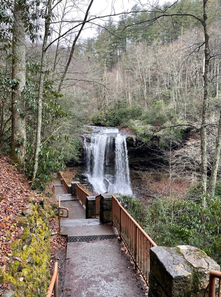 As I have stated before in my blog, K2 and I love a good waterfall. Near the end of the scenic mountain road, also known as Hwy 64, and close to our final destination of Highlands, North Carolina, there is a small turnout in the road for a place called Dry Falls. Dry Falls sits in the Nantahala National Forest and is one of many falls along the Cullasaja River. Any opportunity for a reasonable walk to a waterfall is readily accepted by us both and so, we pulled into the empty parking lot to see what the place was all about. There was a path and stairs that made the walk easier than some we have visited in our travels. As with any good waterfall, you can hear the roar of the water long before you can see it or feel the spray of mist on your face. Dry Falls was anything but dry on that day, as recent rains from the previous days and weeks had swollen the river above and it was dropping the 75 feet below with authority and with volume. I only found out later that the name comes from the fact that in the dry season you can actually walk behind the falls to the opposite side and not get wet from the water. That was not the case on this day, but the ability to wander behind the falls was still viable and so we stood behind the water as it rushed by us from the bluff above and managed to stay reasonably dry in the process. It truly is spectacular to witness these things up close and in person. Just watching the wall of water pass by us as we stood there, reminded me that there are bigger, more powerful forces out there that shape our environment and our world. It is always good to feel small in a good way. It is always nice to be put in place in our position in this world and in the grand scheme of things, to find our perspective again in nature. We highly recommend making this a stop if you find yourself meandering along Hwy 64 near the Carolina border in your wanderings and your travels. After a few moments enjoying the scenery, we climbed back up the stairs to the car to finish the final leg of our journey. On to Highlands, North Carolina.