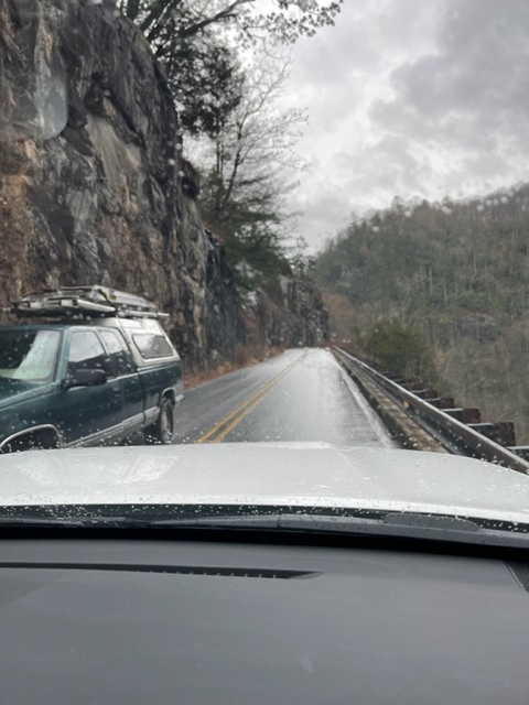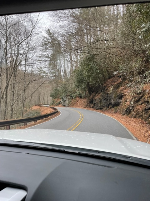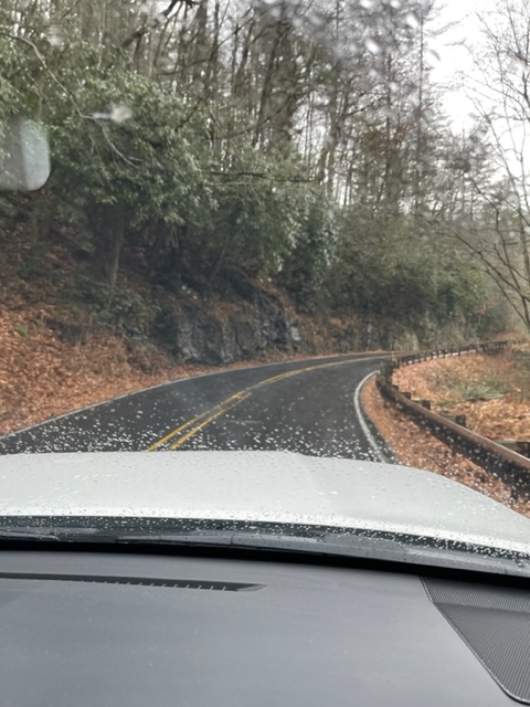 After leaving our little cabin in Wears Valley, K2 and I turned south heading to Highlands, NC for a brief 3 day stay. Before embarking over the mountains and the many a twist and turn of the roads ahead, it is important to fuel up before one begins. And so, K2 and I stopped for coffee. Our love, or possibly obsession, with coffee is not what one would imagine. While it is true that in many situations, we will scout out coffee shops in an area we plan to visit more ardently than perhaps the actual place we will be sleeping, it is not for the beverage alone that we invest so much of our time. It is for the ambiance, the atmosphere, the quaint and familiar feel of home on the road. Oh, good coffee is important too, (or in my case, hot chocolate). It is just that we do not want to feel like we are sitting in some chain coffee establishment with all the modern fixtures and equipment, 300 different coffee types to choose from, and all of them taste the same. Sometimes less is more. We remember the experience long after the food or beverage. I refer to these places as all style and no substance. Of course, it is great if both are outstanding, both the beverage and the place, but that is unfortunately not always the case. For some people it is not that important what the atmosphere may be, and they are fine for any of you that enjoy them, it is just not our cup of tea…or should I say coffee? With that as a way of a backdrop of sorts, I give you the Heavenly Roast Coffee Shop. Swings on the front porch welcome you in and once inside you feel like you just stepped into a cabin in the woods for a nice warm up from the winter cold. It has a quaint and warm feel of a mountain cabin with rocking chairs in the corner and a fire burning in the fireplace. At the time of our visit, it was just before Christmas so you had the added charm of the seasonal decorations complete with a trimmed tree. It also was convenient that it sat on the corner of the road that we would start our trek shortly after our brief, albeit essential stop. Stop in sometime if you are in the area and tell them I sent you. They will have no idea who I am or why you said that, but just smile like you know something that they do not and enjoy the coffee and the ambiance. So, with coffee in hand, we began our journey south through the Smokies. As luck would have it, or at least our luck, it began to rain about the same time we were sipping our first coffee in the parking lot. At least it was not snowing, right…? It was a steady rain and not a deluge of water coming down, but given the already narrow mountain roads with the many twists and turns, it does make the trip more arduous, stressful, and daunting—especially for the driver. That short straw I purchased online was starting to pay big dividends for me as I enjoyed the rain-soaked scenery as K2 tightened her grip on the steering wheel and we wove our way through the mountains.